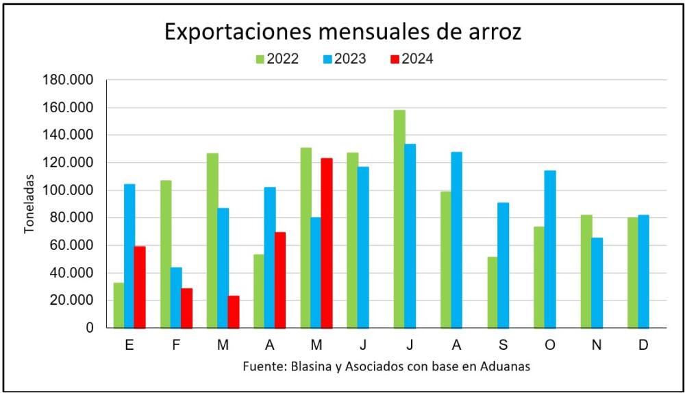 Las exportaciones del cereal totalizaron US$ 82 millones en mayo, un monto 85% superior al de mayo de 2023. “Este notable dinamismo se debió principalmente a las ventas externas hacia Brasil (US$ 24 millones) y Panamá (US$ 11 millones)”, destacó Uruguay XXI.