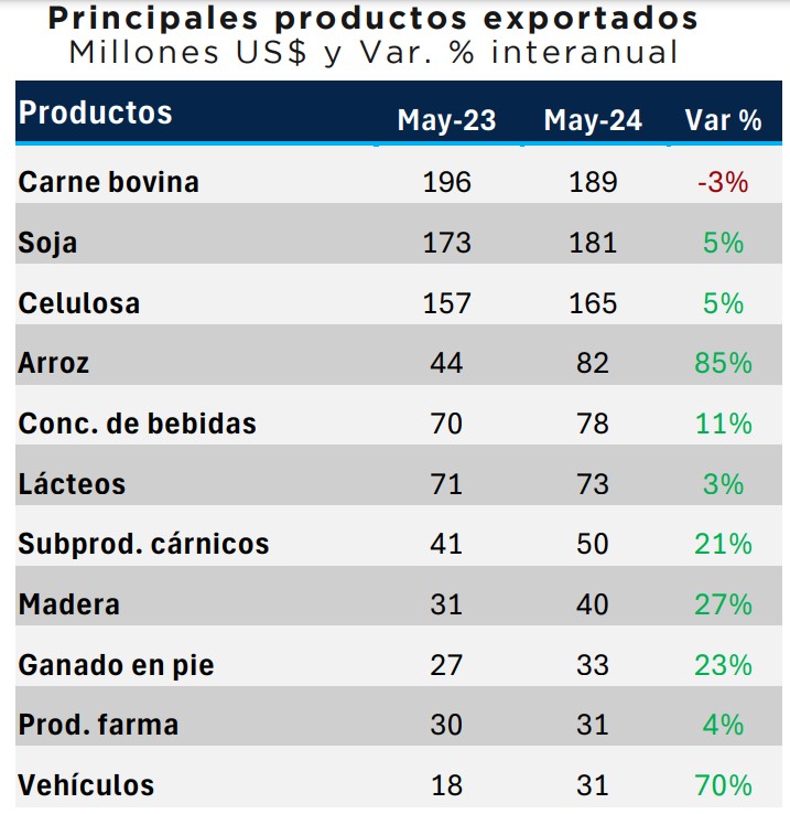 La carne bovina fue el principal producto exportado del mes, a pesar de una caída de 3% en facturación respecto al mismo período del año anterior. En términos de volumen, las exportaciones aumentaron 6%. Aunque el precio promedio de exportación experimentó una caída interanual de 9% en mayo, registró un repunte de 6% respecto a los precios de abril, apuntó Uruguay XXI.