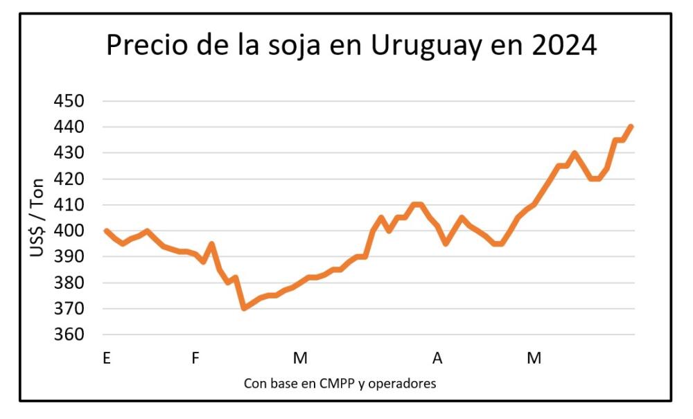 En abril y mayo se activó la comercialización de soja en Uruguay, una decisión que venía demorada por los bajos precios y la incertidumbre sobre el resultado de la campaña luego del fracaso del año pasado. Fueron exportadas 760 mil toneladas hasta el 21 de mayo con una facturación de US$ 330 millones, un precio medio de US$ 434,6 por tonelada.