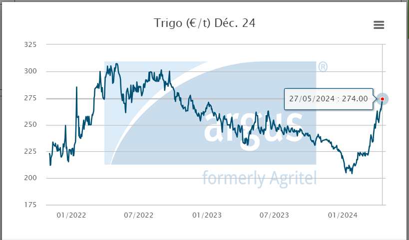 Este lunes no hubo operativa en la Bolsa de Granos de Chicago por el feriado del Día de los Caídos. Pero Europa no descansó y en la bolsa de París el precio del trigo se disparó a máximos desde diciembre de 2022: 274 euros por tonelada en la posición diciembre, unos US$ 297/ton.