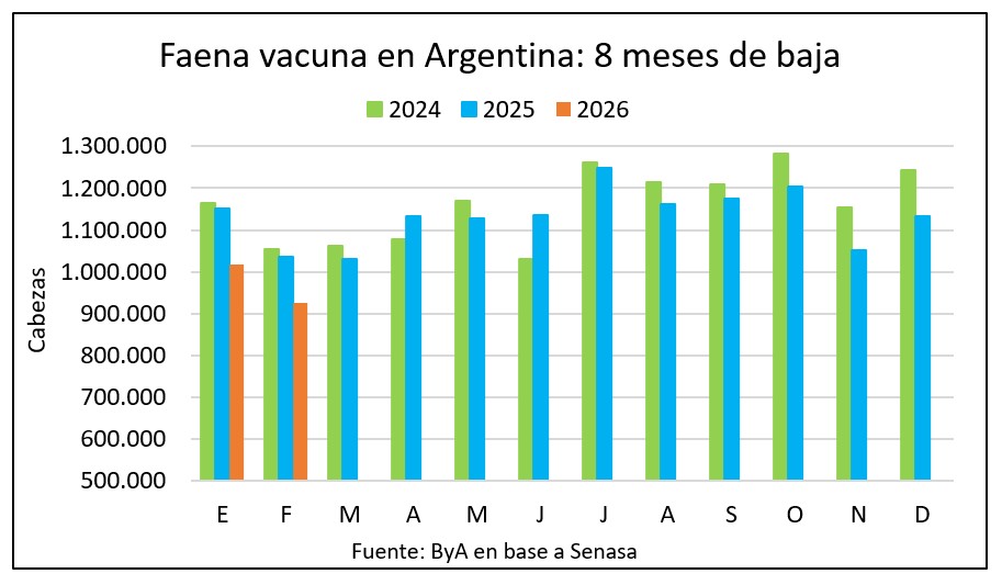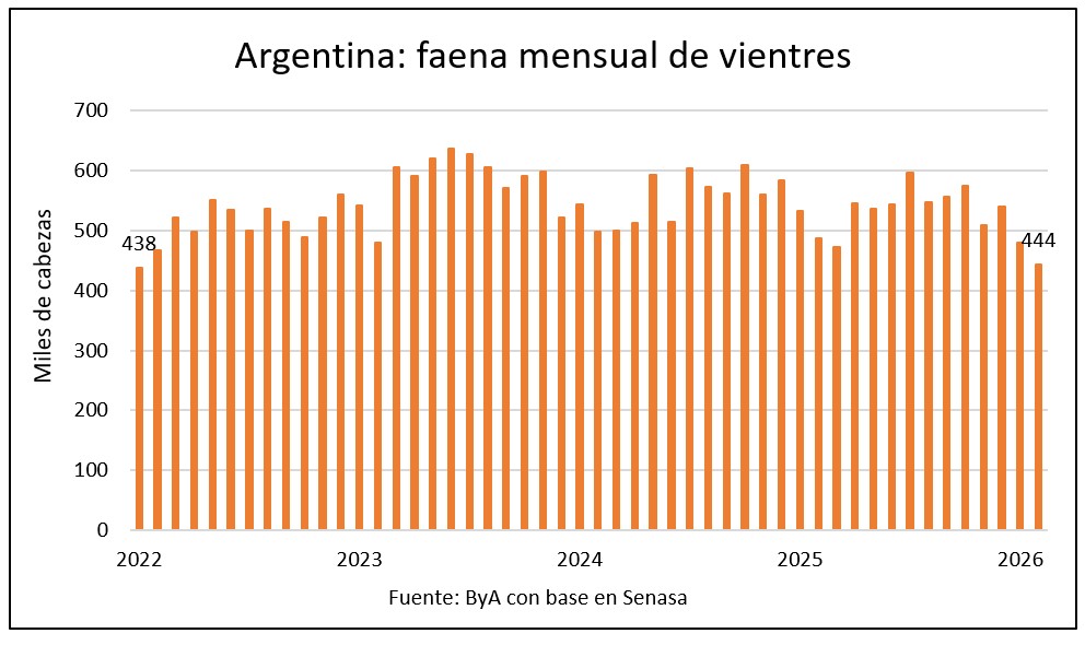 En febrero se faenaron en Argentina 444 mil vacas y vaquillonas, un número 9% inferior al de febrero de 2025, que sumó 487 mil cabezas.