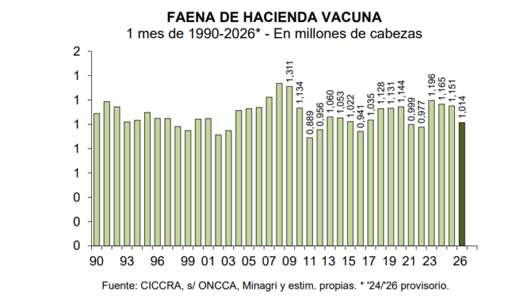 En Argentina cae la faena, cae la producción de carne, y sube el precio del novillo. En enero se faenaron 1,014 millones de cabezas, 16% menos que en diciembre y 12% menos en la comparación interanual. Con este ajuste, la producción de carne vacuna se redujo a 239.000 toneladas peso … Sigue leyendo Argentina: la faena cayó 12% y se retrajo 10% la producción de carne