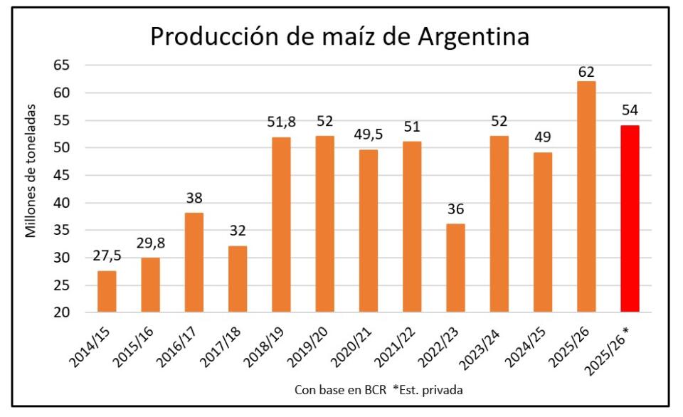 Para el caso del maíz, el productor estimó que la cosecha se achicará de los 62 millones de toneladas esperados en diciembre último a un volumen ahora de 54 millones de toneladas.