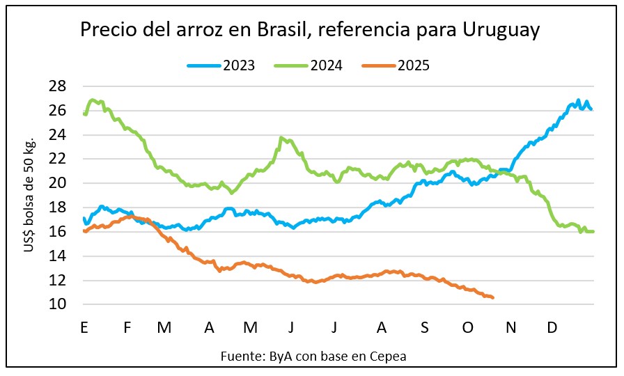 En el sur de Brasil la bolsa de 50 kilos de arroz cáscara, referencia para Uruguay, cotizó a US$ 10,76, con una baja de 4% mensual y más de 45% en lo que va de año.
