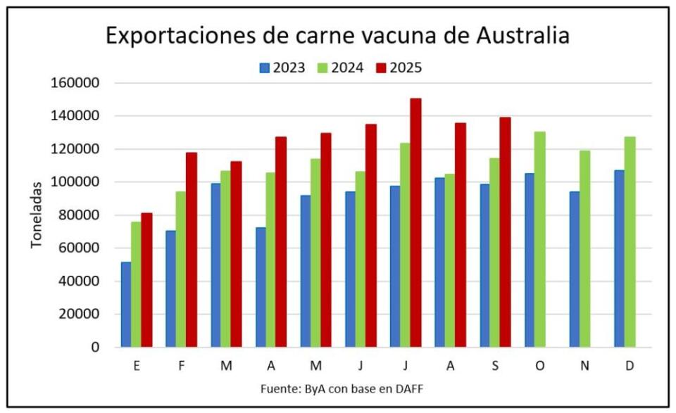 La exportaciones de carne vacuna de Australia siguen batiendo récords. El volumen de setiembre fue el más alto de los registros con 139.013 toneladas embarcadas, 22% más que hace un año.