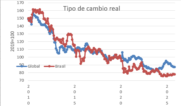Este lunes el Banco Central informó de una leve mejora del tipo de cambio real, de 86,99 a 87,31. Eso obedece principalmente a la mejora en la competitividad con Argentina. Sigue la desmejora en la competitividad extra regional lo que incluye a China.