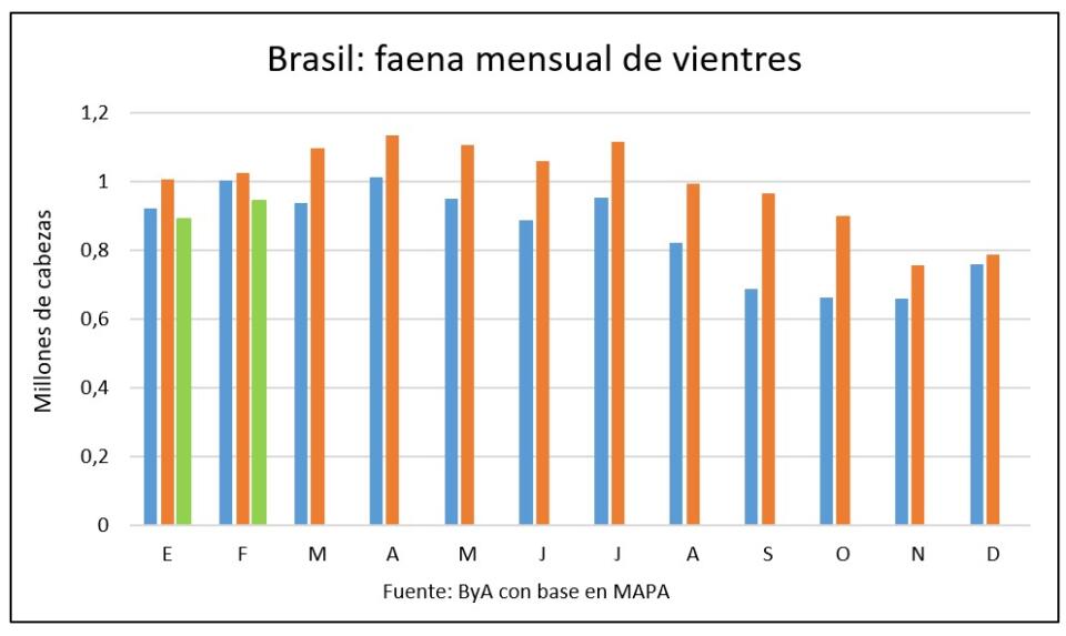 En febrero se observó un descenso de 8,1% en la faena de vacas y vaquillonas en Brasil, lo que confirma un cambio de ciclo desde la liquidación hacia la retención de hembras que contribuirá a afirmar los precios de la hacienda y posiblemente a reducir el volumen de producción de carne vacuna, aunque sobre este punto algunos analistas consideran que el incremento de los pesos de carcasa podría compensar la reducción del número de animales faenados.