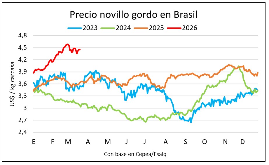 En un mercado cauteloso, con propuestas de precio de la industria por debajo de los valores de US$ 4,50 a US$ 4,60 que se manejaron dos semanas atrás, las operaciones por novillo en las principales plazas de Brasil se realizaron entre US$ 4,35 y US$ 4,45 en la última semana.