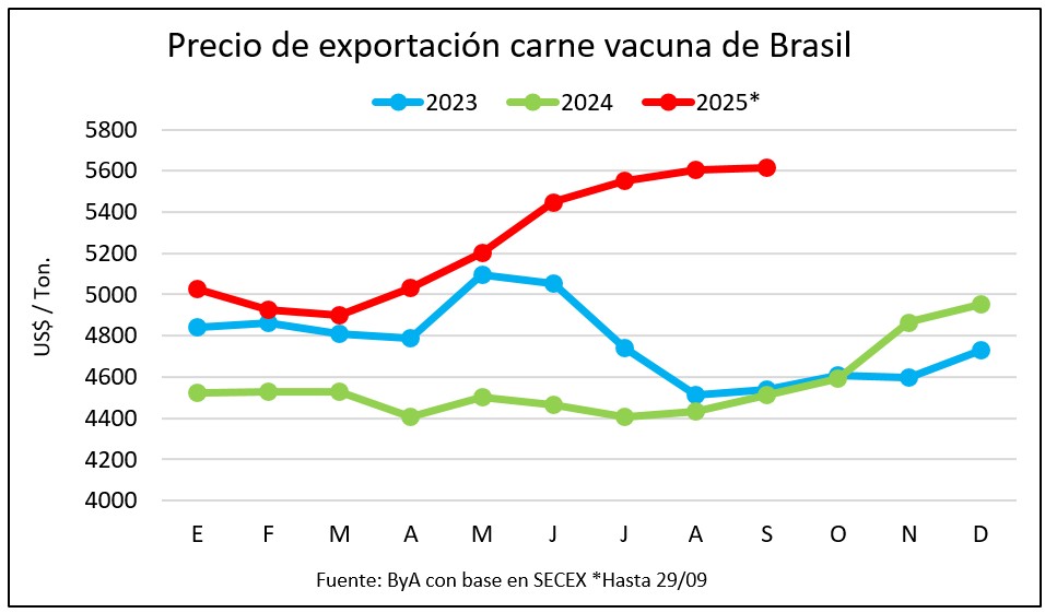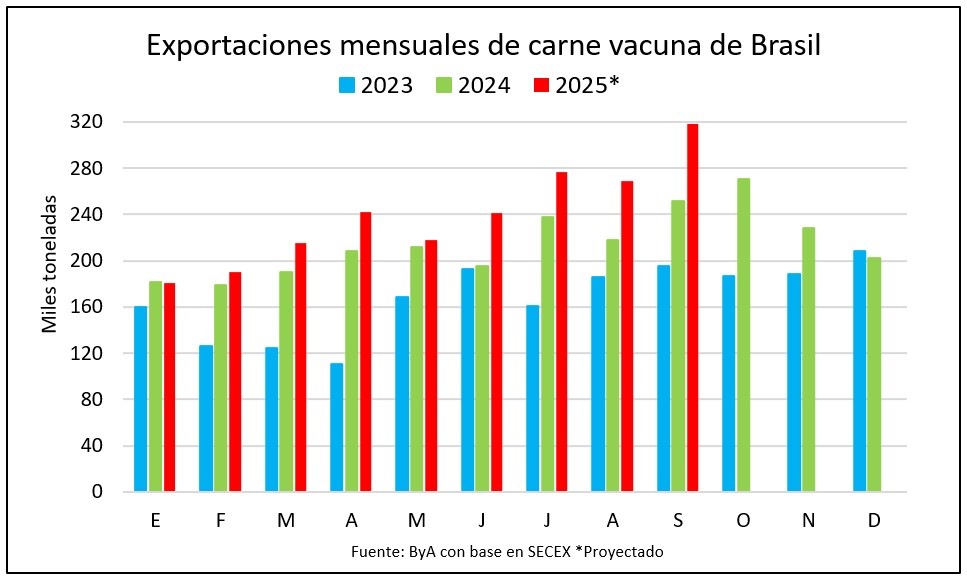 Las exportaciones de carne vacuna de Brasil batieron un récord histórico en setiembre. Cuando aún restaban dos días hábiles para cerrar el mes la Secretaría de Comercio Exterior (Secex) informó que se embarcaron 294.700 toneladas, superando el máximo anterior de 277 mil toneladas en julio de este año.