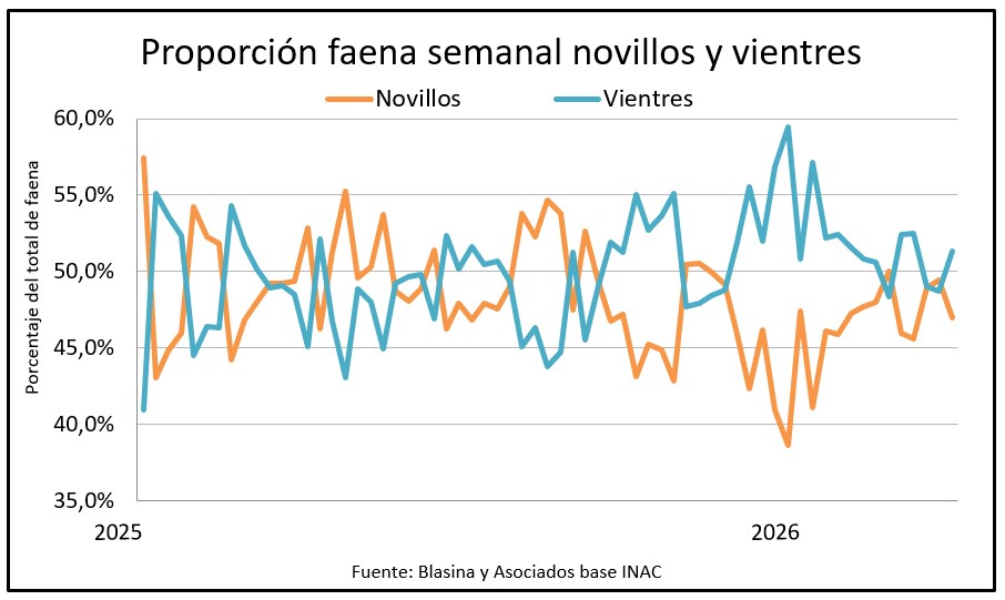 De acuerdo a las cifras de INAC actualizadas este lunes la proporción de novillos en la faena bajó de 48,5% a 47% en el acumulado del primer trimestre en comparación a 2025.