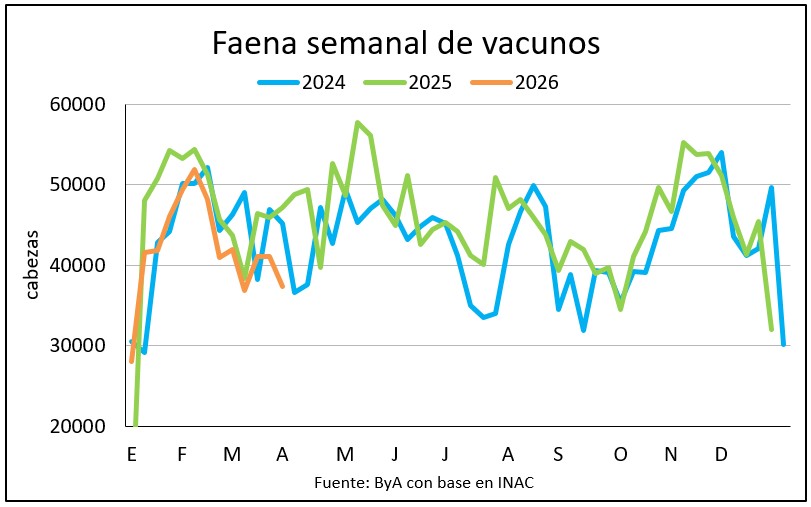 La faena vacuna de la última semana bajó a 37.316 cabezas, unas 3.800 menos que la semana anterior (-9%) con una reducción proporcionalmente mayor en los novillos que en los vientres.