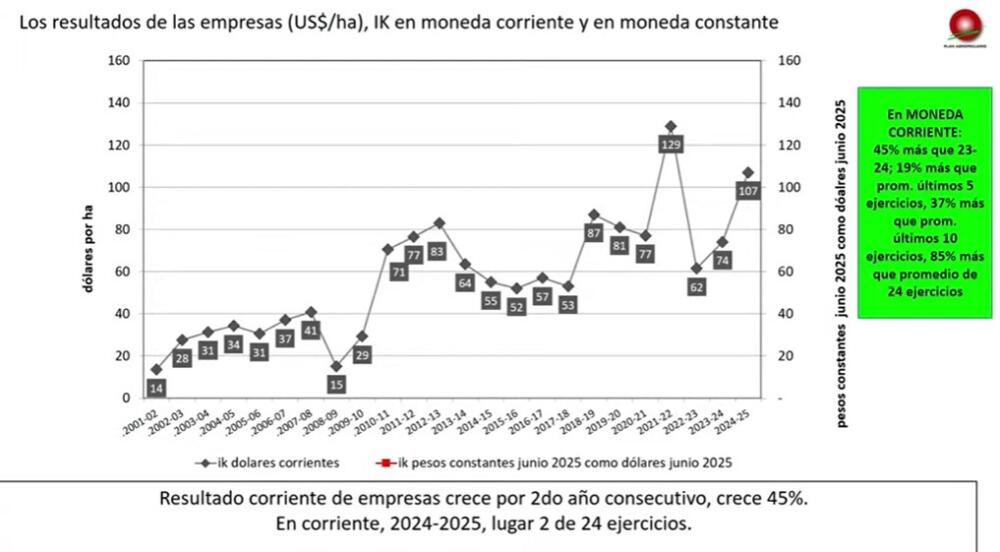 Las empresas ganaderas monitoreadas por el Plan Agropecuario tuvieron un ingreso promedio de US$ 107 por hectárea en el ejercicio 2024/25. Esto es 45% más que el año pasado (US$ 74 /ha) y 19% más que en el promedio de los últimos cinco ejercicios.