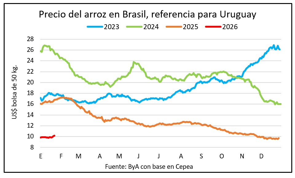 En los últimos cuatro días de operativa el precio del arroz en Brasil tuvo una ligera mejora –en parte por correcciones cambiarias- y superó los US$ 10 por bolsa por primera vez desde fines de noviembre.