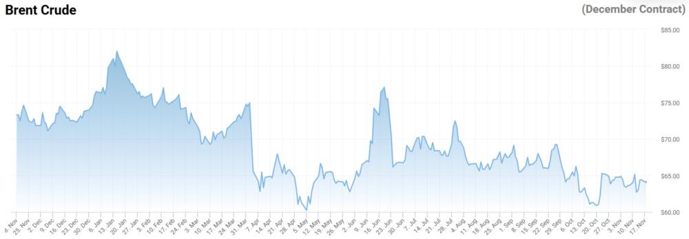 Desde fines de setiembre el precio del petróleo Brent, de referencia para Uruguay se ha mantenido en el eje de US$ 64 por barril, con pocas variaciones, en un mercado que ha aumentado la producción a pesar de que la demanda por combustible fósil muestra señales de crecimiento que son menores al incremento de la oferta.