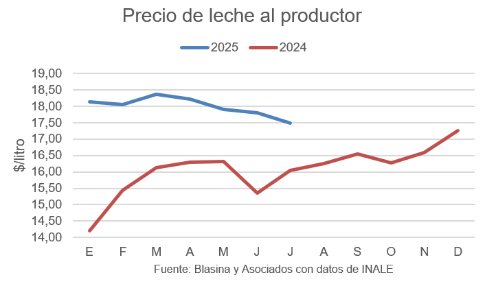 El precio de leche recibido por el productor en julio fue el más bajo del año medido en pesos. Promedió $ 17,49 por litro para una composición promedio de 3,99% de grasa y 3,60% de proteína, de acuerdo a los datos publicados por INALE.