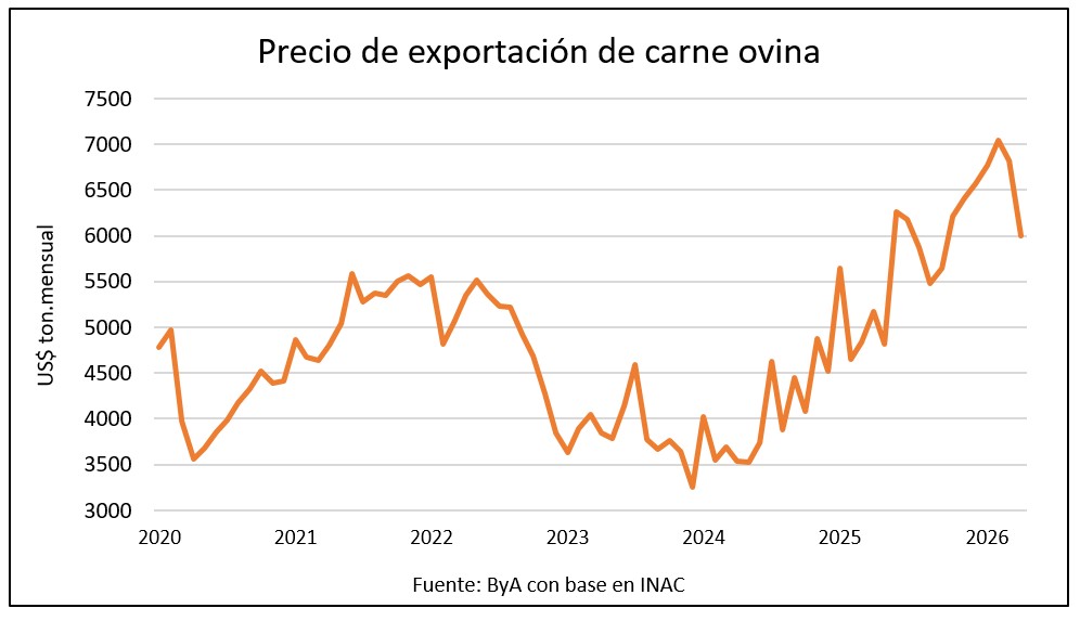 La carne ovina ha mostrado cuatro caídas consecutivas semanales, pero aún así manteniendo muy buenos valores. En los últimos 30 días se exportaron 574 toneladas a un promedio de US$ 6.005. En la última semana fueron 171 toneladas a US$ 6.636.