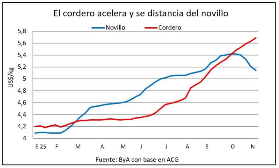 Los ovinos no aflojan en un mercado que ACG describe “con buena oferta y precios firmes” y esta semana “entradas más largas”. El cordero superó el récord histórico de US$ 5,63 de la semana anterior y trepó a un nuevo máximo de US$ 5,69, las ovejas agregaron cuatro centavos hasta US$ 4,77 y los capones cinco centavos a US$ 4,85 por kilo.