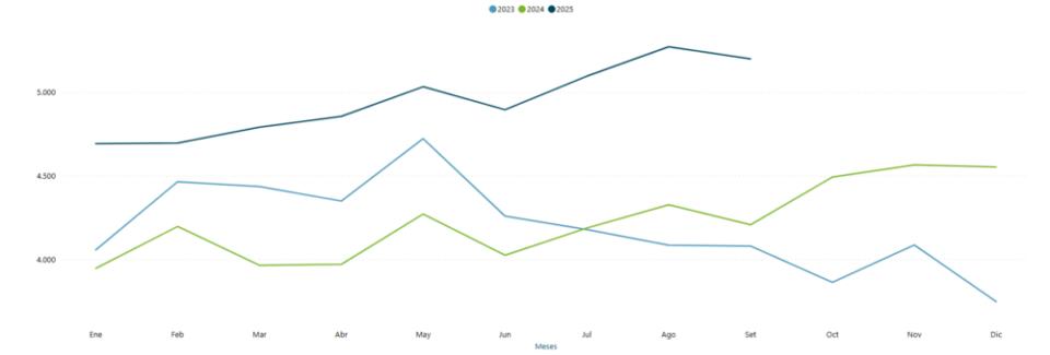 Y setiembre marcó un tercer mes de baja consecutiva en el precio promedio. Fue de US$ 5.481 (el máximo del año se dio en junio con US$ 6.285). Asimismo, 24% por encima de los US$ 4.439 de mismo mes de 2024.