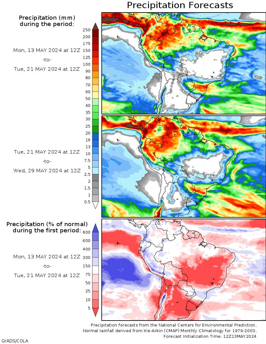 Al menos hasta el 22 de mayo lluvias en las zonas agrícolas del centro y oeste del país. Antes algunos chaparrones costeros y la posibilidad de lluvias en zonas limítrofes con Brasil pero de menos entidad de las que se preveían hasta el lunes de mañana. En zonas limitrofes con Brasil pueden venir lluvias el 21 y 22 de mayo. El frío queda firmemente instalado. Probablemente la transición de Niño a Niña está empezando y anticipan a la primavera cuando también quede instalada.