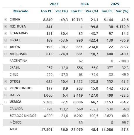 El volumen exportado también es 36% inferior al del mismo lapso de 2023, cuando se embarcaron 17.501 toneladas de carne vacuna.