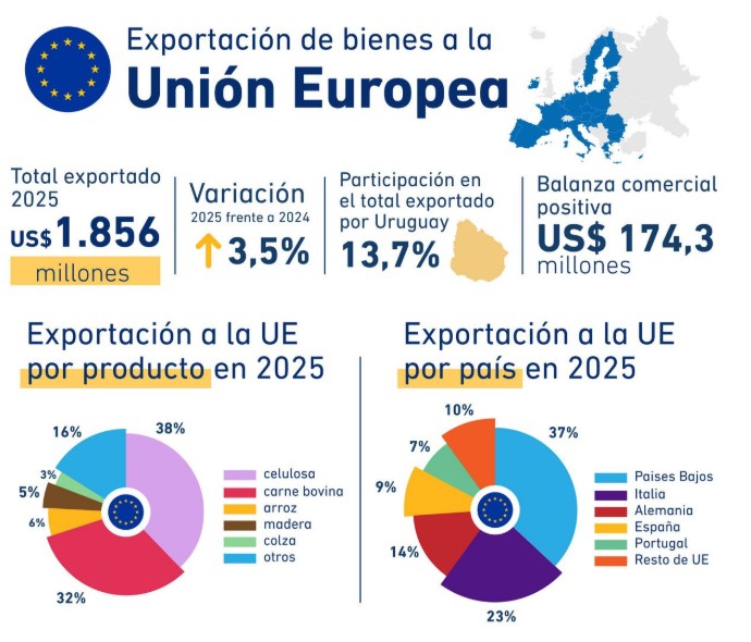 Las exportaciones de bienes a la Unión Europea representaron el 13,7% de las exportaciones de Uruguay en 2025 y, tomado en su conjunto, el bloque se posicionó como el tercer mayor destino de bienes del país, luego de China y Brasil.