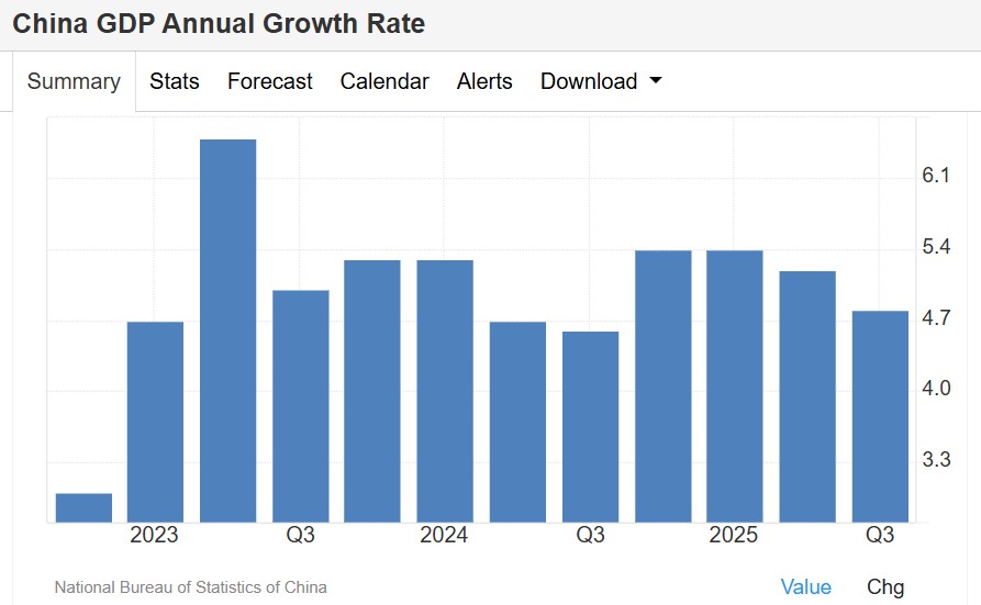 La guerra comercial entre Washington y Beijing se reflejó en el enlentecimiento del crecimiento de China en el tercer trimestre que bajó desde 5,2% a 4,8% respecto al segundo trimestre, su ritmo más lento en un año por el enfrentamiento tarifario y problemas en su mercado inmobiliario.