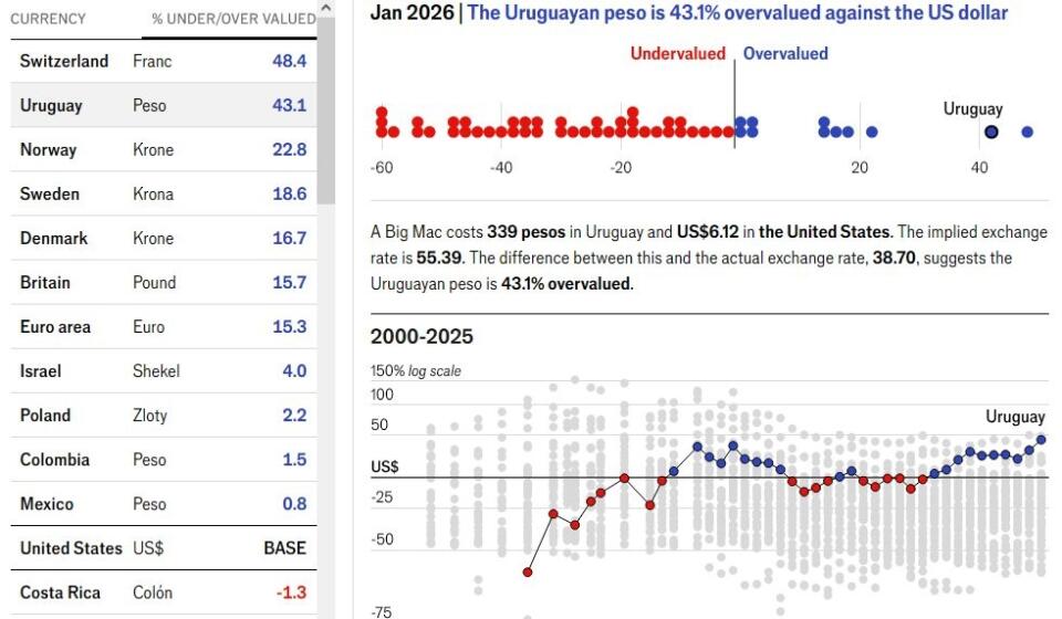 A enero de 2025, en el mismo índice, Uruguay figuraba tercero, detrás de Suiza y Argentina. La sobrevaluación de peso uruguayo se estimaba, por ese entonces, en 19,3%.