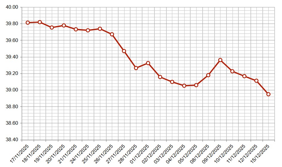 El dólar interbancario cerró a $ 38,948 este lunes y perforó el piso de $ 39 por primera vez desde junio de 2024. La cotización cayó 0,4% respecto al viernes y 1,05% en las últimas cuatro jornadas seguidas a la baja.