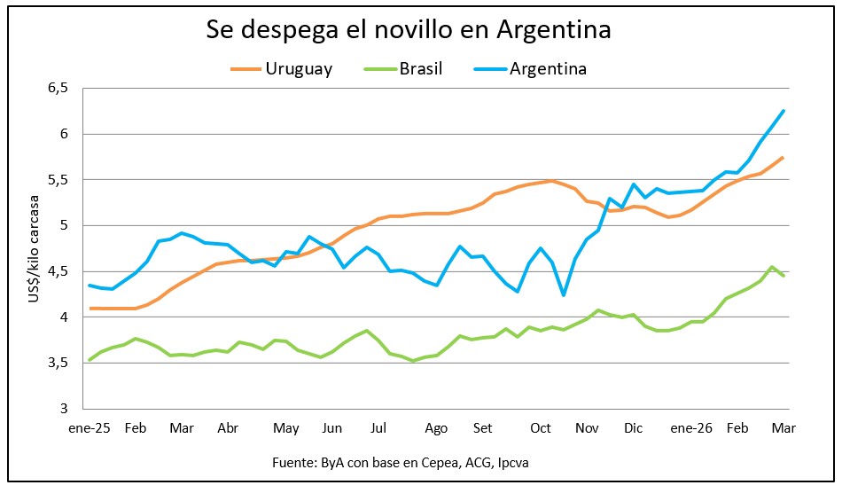 El precio del novillo gordo en Argentina trazado y pesado subió de US$ 6,08 a US$ 6,25 por kilo en cuarta balanaza en la última semana y alcanzó un nuevo récord, impulsado por el mayor precio ofrecido por los frigoríficos y por la suba del peso argentino del 3,5% frente al dólar en el último mes.