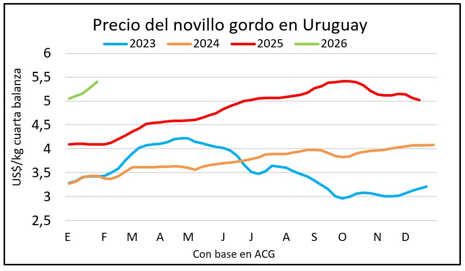 La suba del novillo en dólares es de 3%en la última semana y de 5% en las últimas dos semanas. El precio de los futuros de novillo para marzo llegó esta semana hasta US$ 4,22.