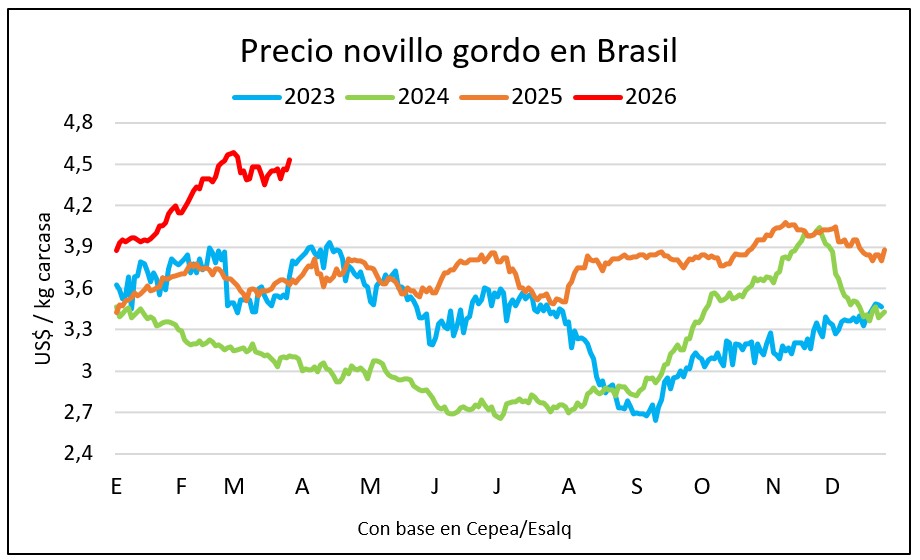 En todo marzo de 2025 Brasil exportó 215.249 toneladas de carne vacuna y en las primeras tres semanas del mes en 2026 llevaba 167.061 toneladas.
