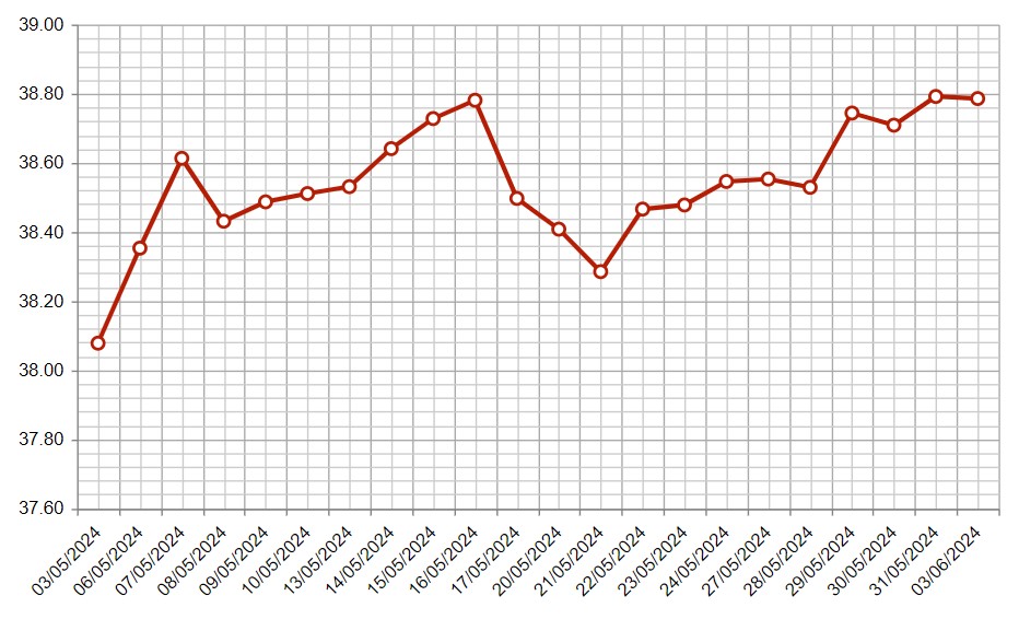 Este lunes el interbancario cerró a $ 38,79 con una ligera variación a la baja respecto al viernes en una jornada en que el dólar bajó moderadamente en Brasil, de RS 5,25 a RS 5,23 y también ajustó respecto a una canasta de monedas globales.