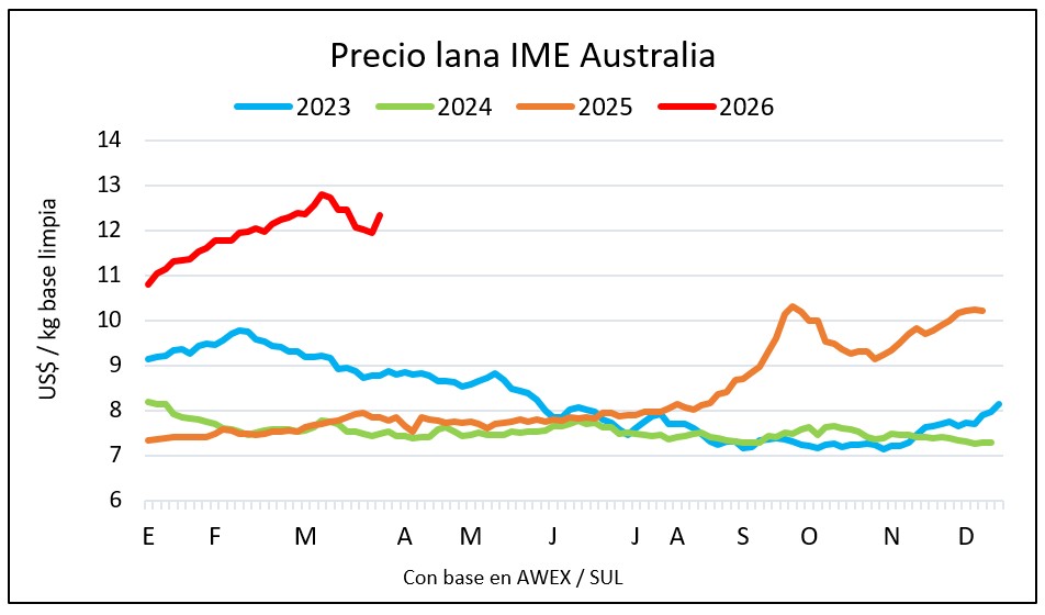 El Indicador de Mercados del Este (IME) abrió la semana con una caída en dólares a US$ 11,95 por kilo base limpia, en virtud del debilitamiento de la moneda australiana, pero se repuso el miércoles para cerrar en US$ 12,34 con un incremento semanal de 2,6%.