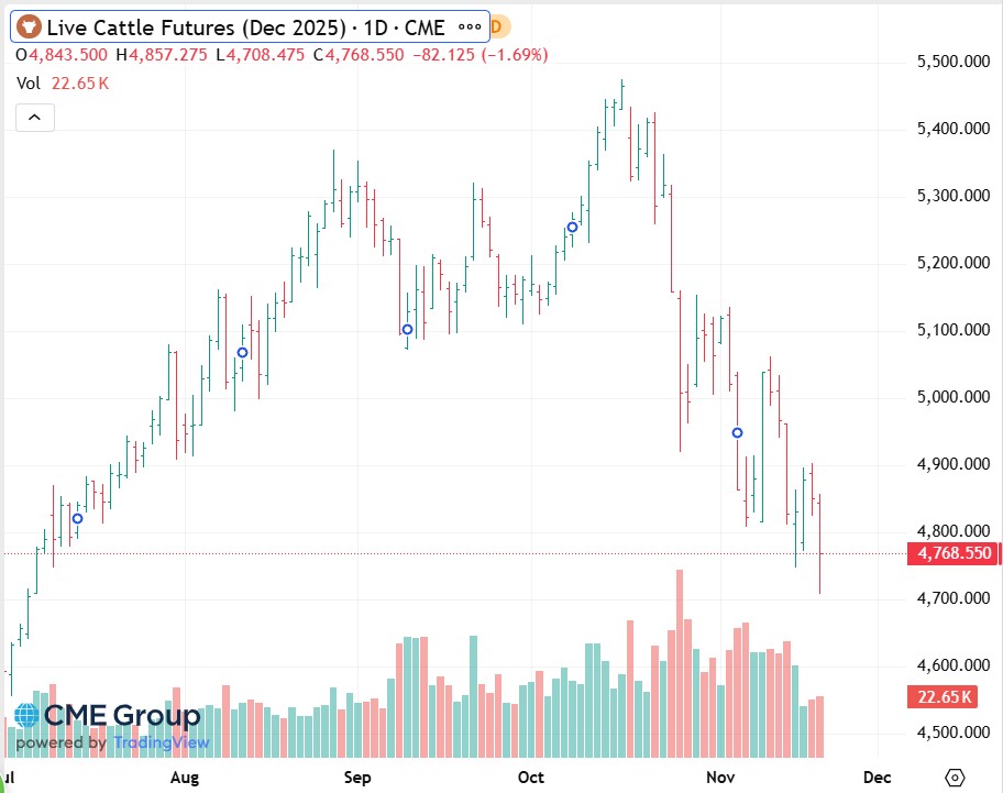 Los futuros de ganado vivo corrigieron desde US$ 5,47 a US$ 4,76 por kilo en pie por un kilo con un ligero repunte este miércoles desde el piso de US$ 4,70 entre el lunes y el martes.