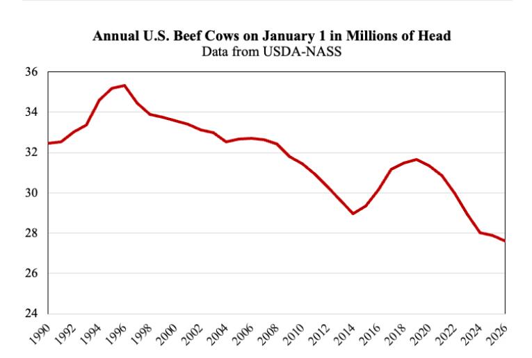 El total de ganado vacuno y terneros (incluyendo leche) al 1 de enero de 2026 se reportó en 86,155 millones de cabezas. Esto representó una disminución del 0,37 % con respecto al año anterior y es el séptimo año consecutivo de descenso. La producción de terneros de 2025 también disminuyó por séptimo año consecutivo y se estimó en 32,896 millones de cabezas, una disminución del 1,56 % con respecto a 2024. Ambos puntos se situaron dentro del rango de las estimaciones previas al informe, pero en el extremo inferior. La generación de terneros de 2025 fue 3,39 millones de cabezas menor (9,3 %) que en 2018, el año pico del ciclo ganadero actual.