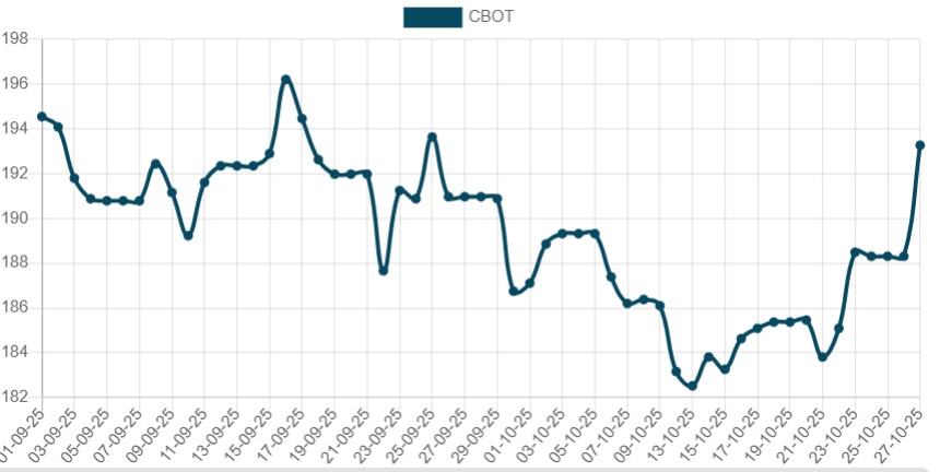Pero el trigo no le fue en zaga y agregó US$ 5 para alcanzar un precio US$ 193,25 por tonelada en la posición diciembre 2025, de referencia para la cebada en Uruguay.
