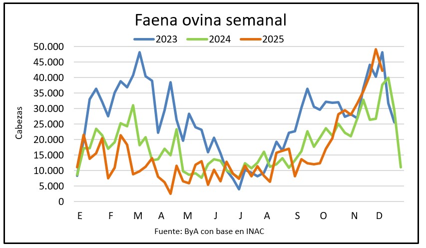 Hasta el 13 de diciembre fueron faenados 90.136 ovinos, 119% más que los 41.119 del mismo periodo de 2024 y 30% más que en ese lapso de 2023.