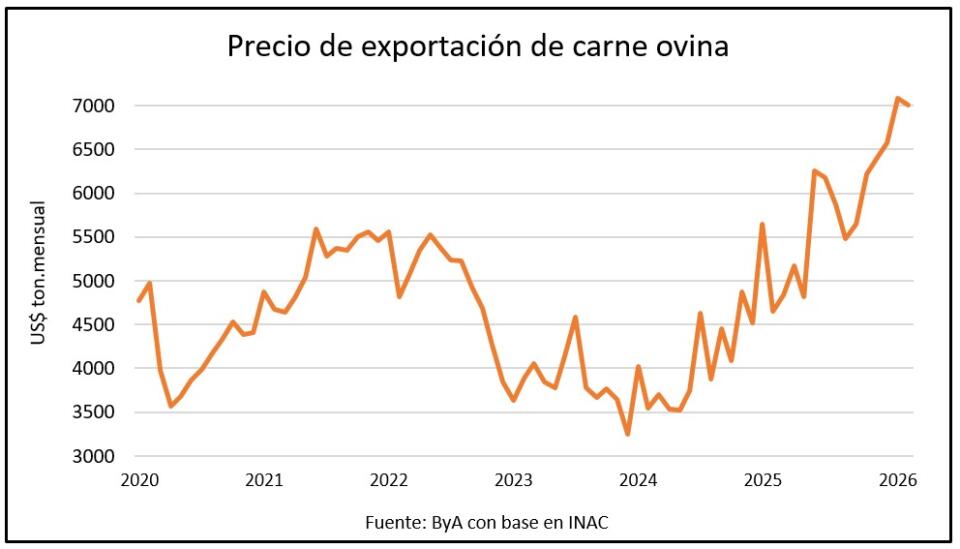 El precio de la tonelada de carne ovina exportada fue de US$ 7.062 en la última semana y de US$ 7.010 en el promedio de los últimos 30 días.
