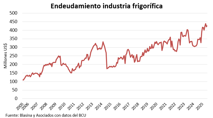 En lo que va del 2025 -exceptuando enero- el endeudamiento de la industria frigorífica con el sistema bancario se ha mantenido de los US$ 400 millones. En agosto fue de US$ 428 millones, el segundo mayor registro histórico tras un máximo alcanzado en junio pasado, de US$ 438 millones, de acuerdo a los últimos datos desagregados publicados por el Banco Central del Uruguay (BCU).