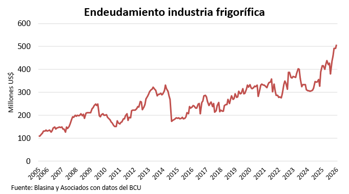 En el primer bimestre del año los créditos totales de la industria frigorífica promediaron US$ 500 millones, 24% arriba de enero-febrero de 2025. Y los créditos vencidos, US$ 13,73 millones, un ascenso promedio de 56%.