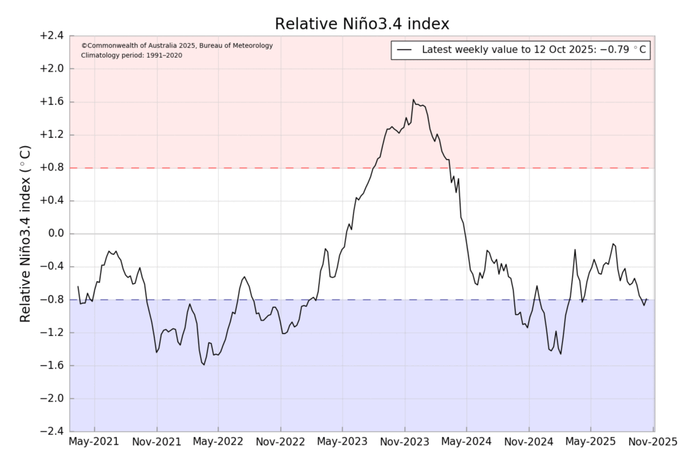 Estamos oficialmente en situación Niña de acuerdo a los servicios meteorológicos de Estados Unidos una Niña que va a ser débil y corta pero que igual marca una situación de riesgo desde noviembre a febrero son meses que van a tener un cierto riesgo de interrupción de las lluvias pero por ahora octubre apunta a terminar de muy buena manera si se concretan estas lluvias en los últimos días del mes.