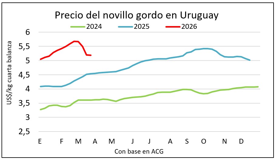Los precios del ganado gordo se han mantenido relativamente estables en los últimos días, con referencias en el eje de US$ 5,10 a US$ 5,20 por kilo para el novillo y en torno a US$ 4,80 —con algún ajuste puntual al alza— para la vaca. Las entradas siguen en un rango de entre 10 y 15 días.
