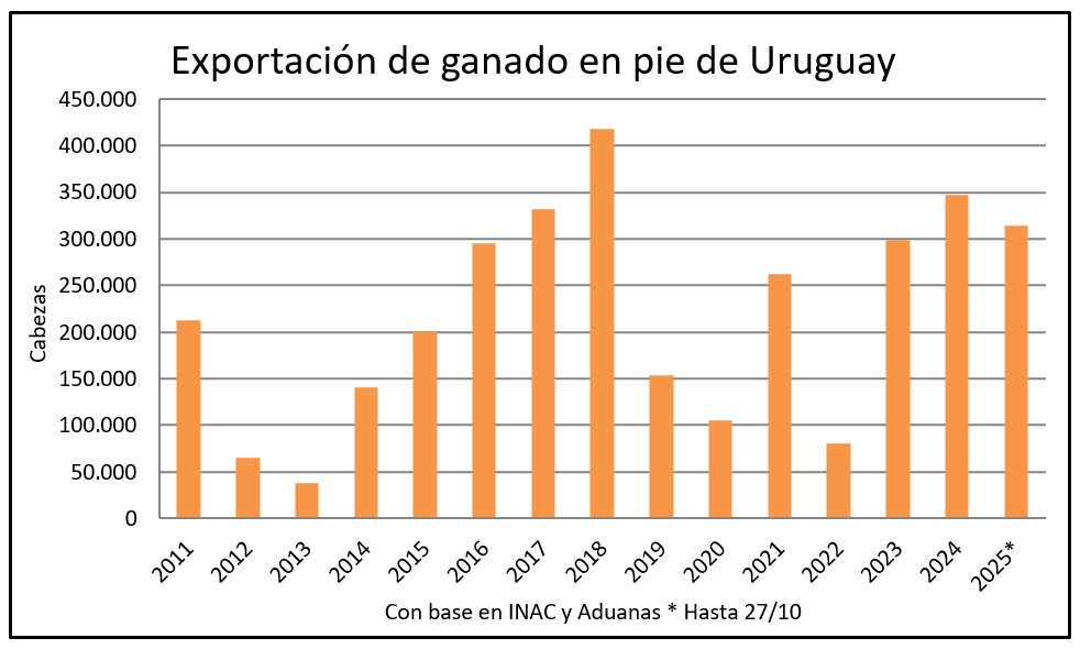 La exportación de ganado en pie alcanzó las 314 mil cabezas este año, 11% más que hasta octubre de 2024. De mantenerse el ritmo de embarques se superarían las 347 mil cabezas del año pasado.