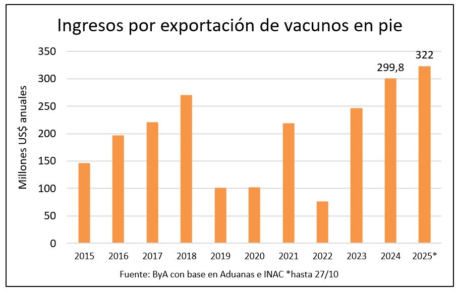 Los ingresos hasta octubre superan los US$ 322 millones y se sitúan en un máximo histórico para el sector, dejando a 2024 en segundo lugar y en el tercer lugar al año 2018 cuando fueron embarcados 421 mil vacunos –año récord en volumen- a un promedio de US$ 2,52 por kilo, el tercer valor más bajo en los últimos 15 años.