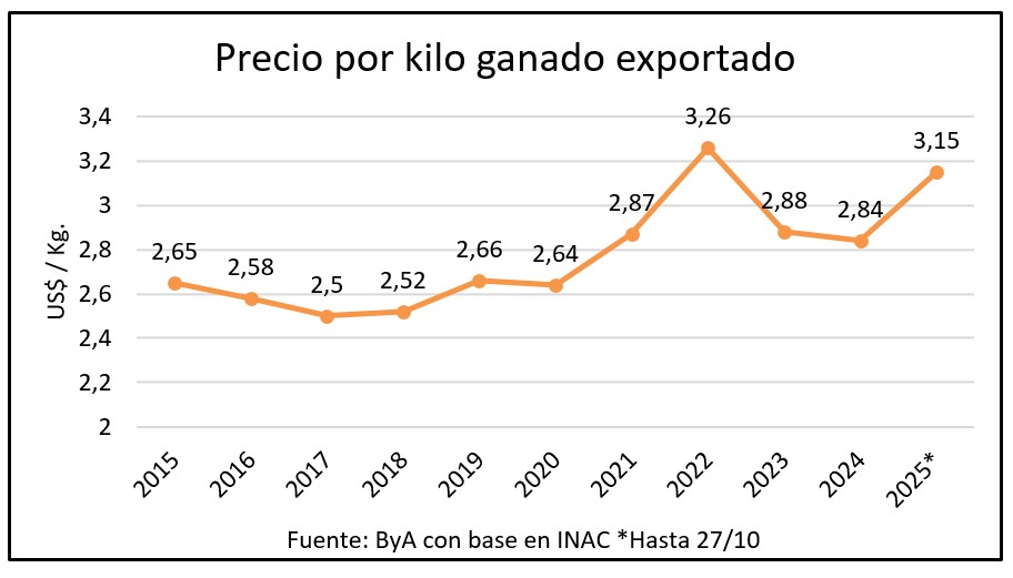 Con valores por kilo 30 centavos superiores a los del año pasado y un peso promedio de 323 kilos por animal frente a 302 kilos en 2024, ya se superó el monto de divisas del sector de todo el año pasado.