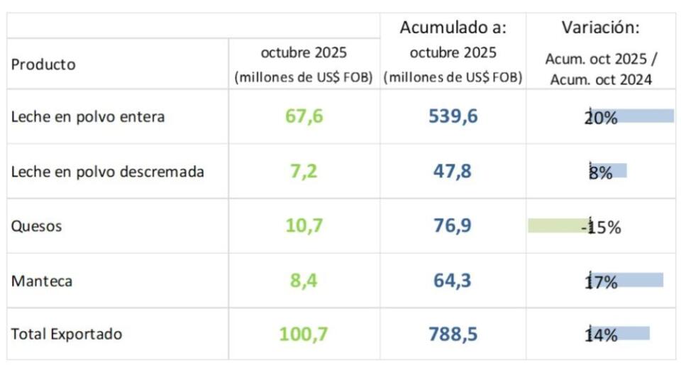 La leche en polvo entera, principal producto de exportación, se incrementó 20% interanual hasta US$ 539,6 millones con un aumento de volumen de 5%. El valor promedio por tonelada en octubre fue de US$ 3.925, un 14% más que hace un año.