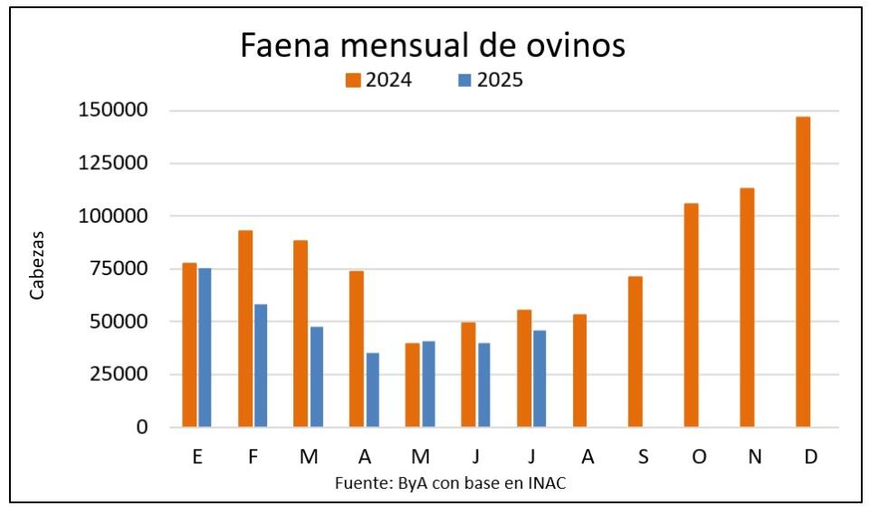 Hasta el 2 de agosto, dentro de un total de 345.714 lanares industrializados solo ingresaron 121.805 ovejas, unas 80 mil menos que un año atrás con una caída de 41%, proporcionalmente más del doble de lo que se redujeron los corderos (-18,7%).