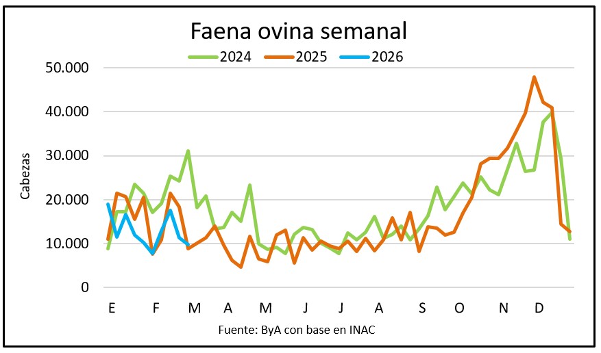 En el acumulado anual el 45% de la faena de 132.915 cabezas hasta el 14 de marzo responde a corderos y 39% a ovejas.