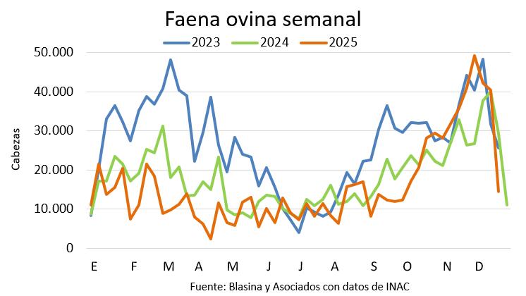 La faena de ovinos se desplomó: pasó de 40.291 en la semana previa a Navidad a 14.473 animales procesados, un descenso de 64%. Fue el volumen más bajo registrado desde comienzos de octubre.