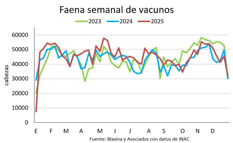 La faena de vacunos cayó a 32.034 cabezas, el menor volumen registrado desde principios de enero de este año. Con el feriado de Navidad de por medio, estuvo 30% debajo de la semana anterior.